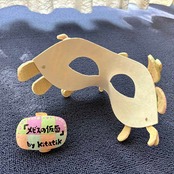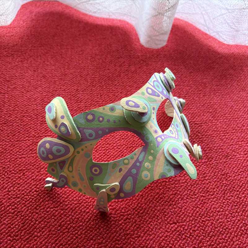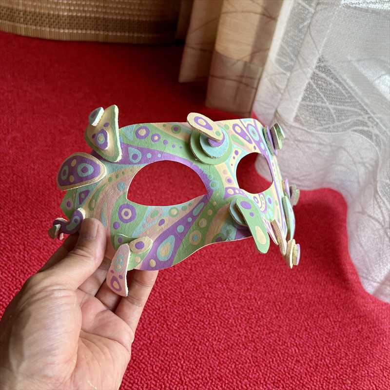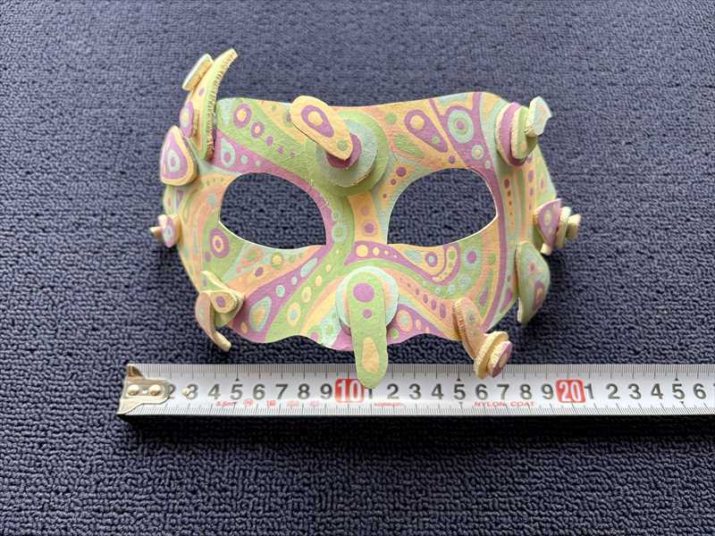 アイマスクタイプの紙製ベースのお面にアクリルガッシュで絵を描き、その上に彩色したひょうたんで作ったパーツをバランスよく配置しています。