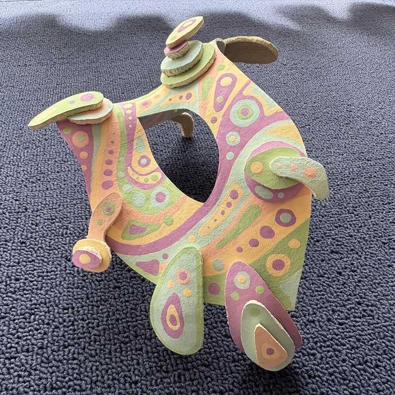 「仮面」という作品名とは裏腹に、表裏がないという意味合いを持つこの作品は、鑑賞者に統合と調和を促し、無限の成長と喜びを願う気持ちを込めています。