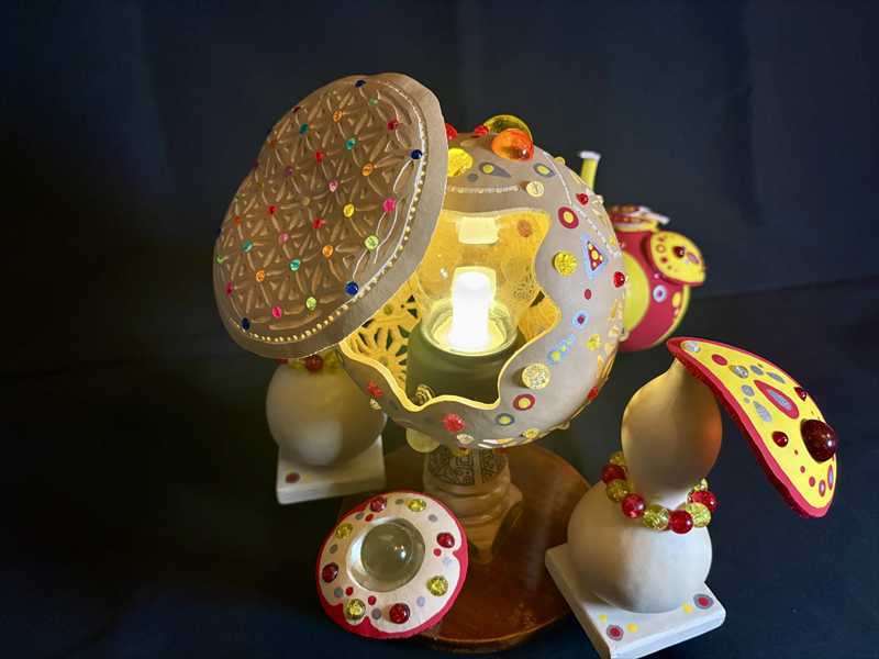 内部には電球を入れられるスペースを設け、前面には神聖幾何学模様を透かし彫りにした蓋をあしらっています。