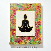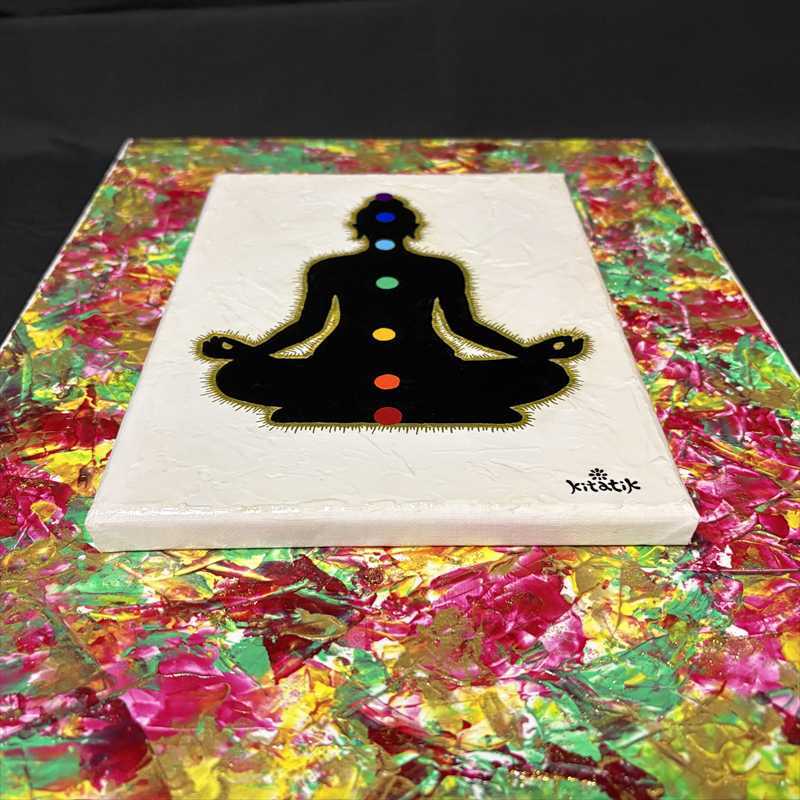 テーマは、身体にあるとされる7つのエネルギーの中心=チャクラ。それぞれに対応する7色を、瞑想する人物のシルエットの上に配置しています。