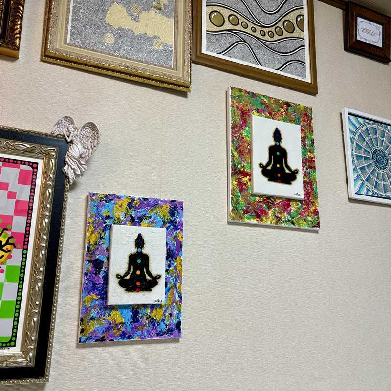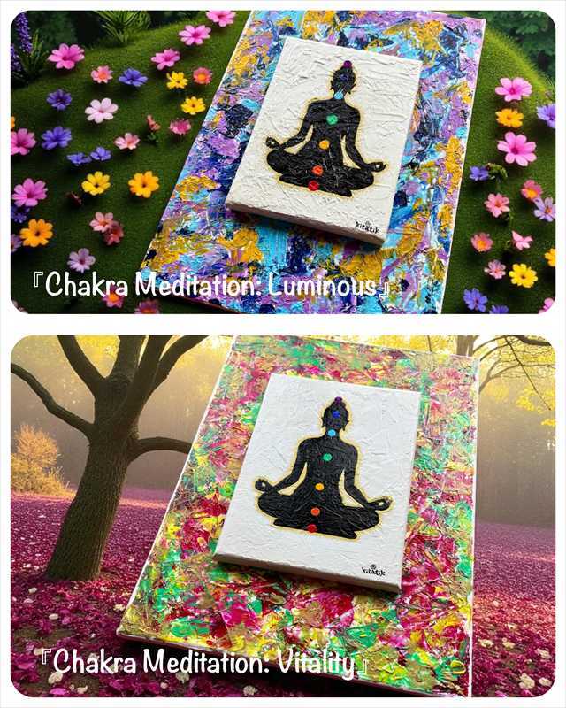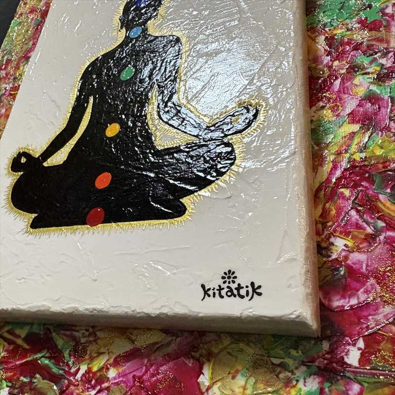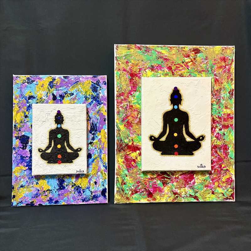アクリルガッシュによる抽象画を背景に、もう一枚の作品を貼り重ねた二重構造で仕上げました。立体感のある表面のテクスチャーと、シンプルで象徴的な構成が調和した「見る瞑想」シリーズの第2作目です。