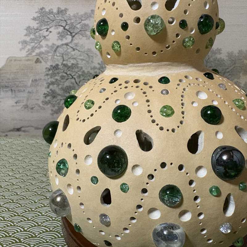緑・黄緑・透明のクラックガラスビーズやビー玉をあしらい、灯りをともすとガラスが鮮やかな緑に輝き、清涼感あふれる光を放ちます。透き通るように美しい白色電球の光が、緑のガラスの彩りをいっそう引き立て、心まで澄み渡るような爽やかさを演出します。