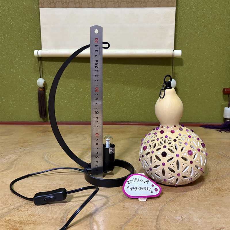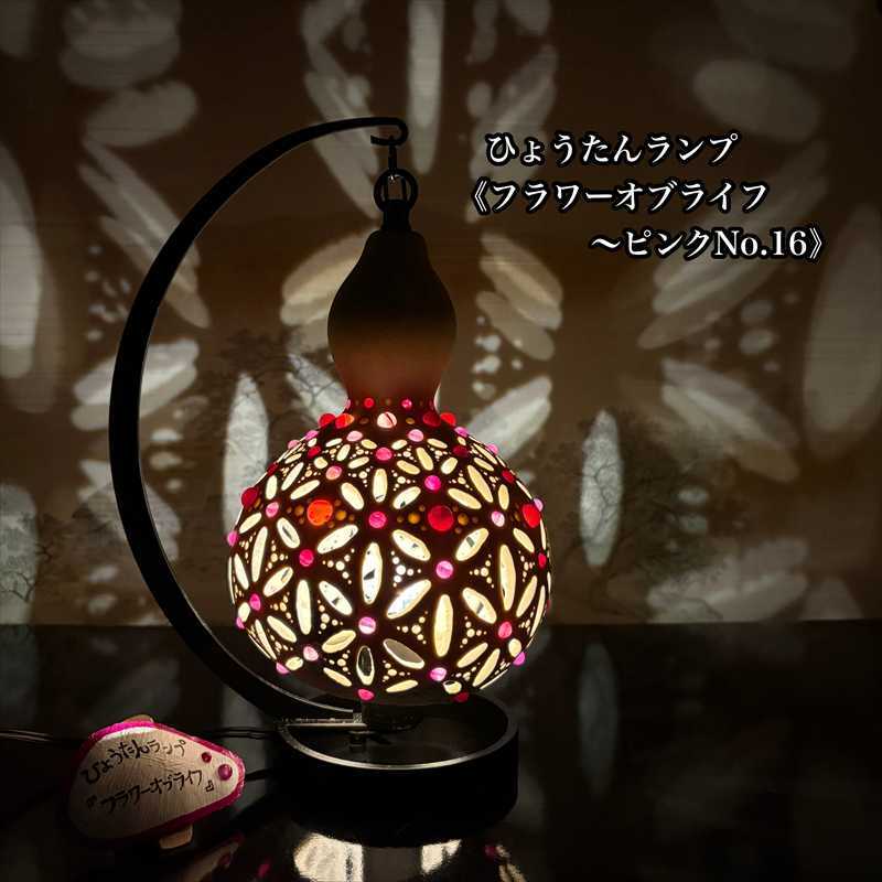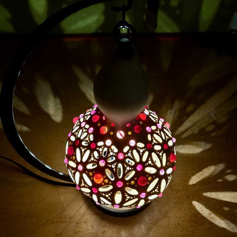 無農薬で自家栽培したひょうたんに、宇宙の神聖幾何学「フラワーオブライフ」を刻み込み、88個の天然石・ピンク瑪瑙ビーズを埋め込んで制作した一点もののランプです。