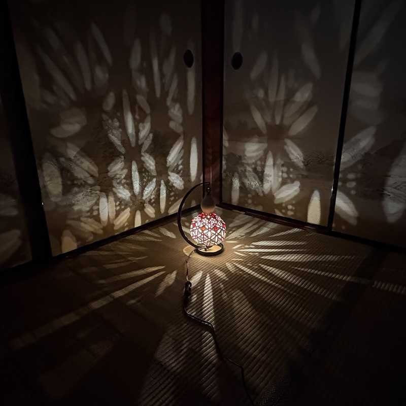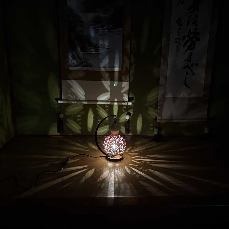 スイッチを入れると、ひょうたんを透かした光が花のように広がり、壁や床一面にフラワーオブライフが浮かび上がります。