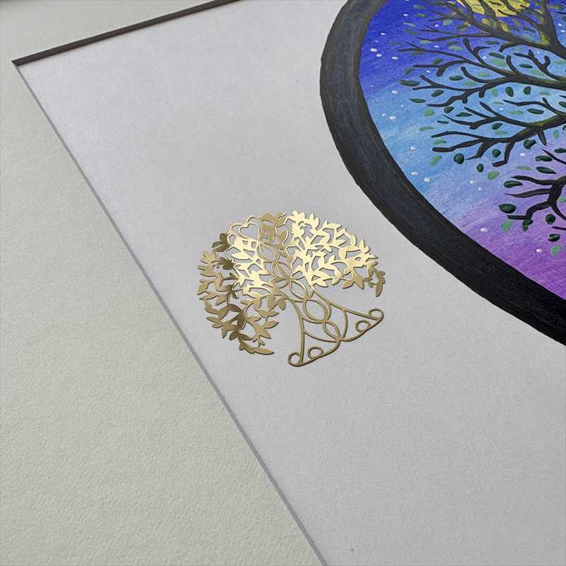 この作品は、円形の窓を通して描かれた生命樹を中心に、満天の星と月を背景にしたシンプルながらも幻想的な作品です。