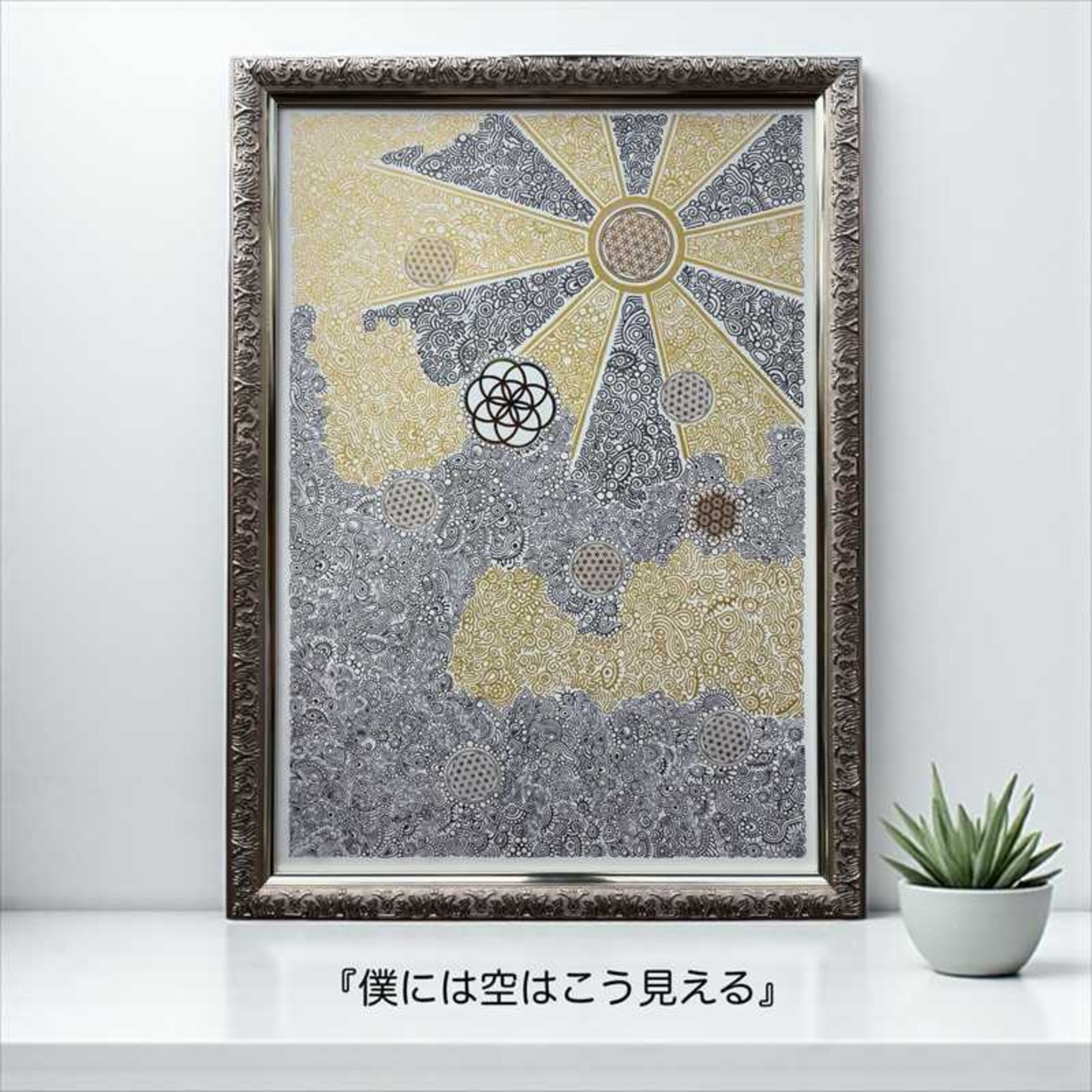 この作品は、神聖幾何学のステッカーを用いた細密画です。