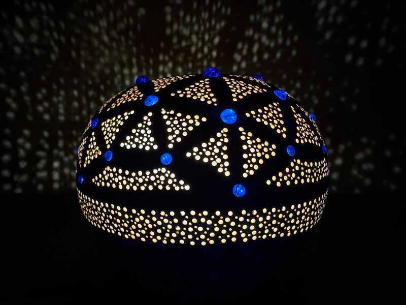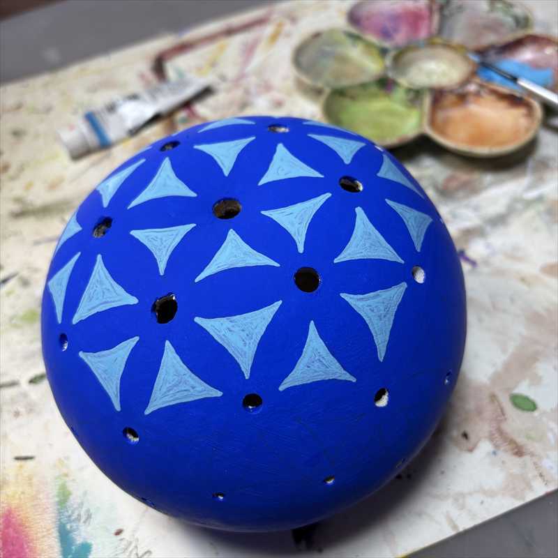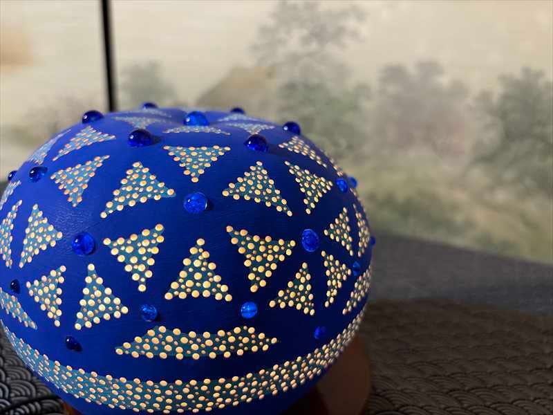 アクリルガッシュでコバルトブルーと水色に彩色し、ひとつひとつ丁寧に神聖幾何学模様を彫り込みました。