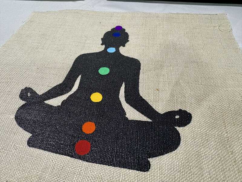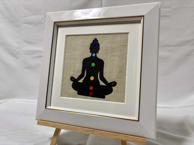 瞑想する人物のシルエットの上に、各チャクラに対応する7色をアクリルガッシュ絵具にて彩色しています。
