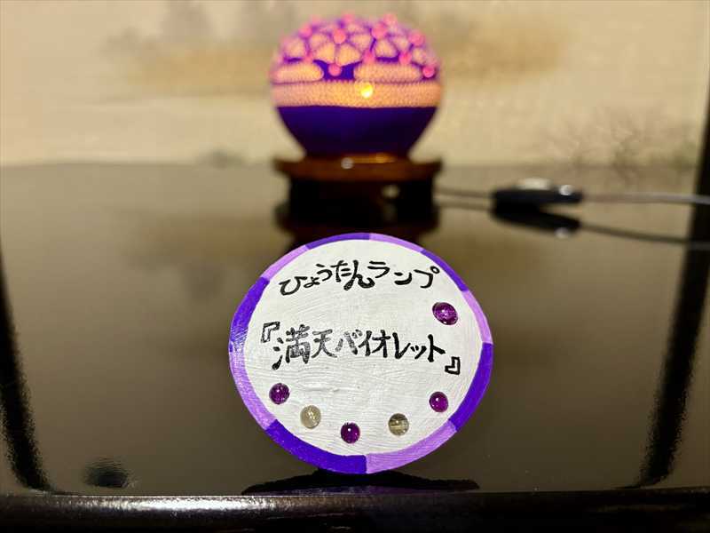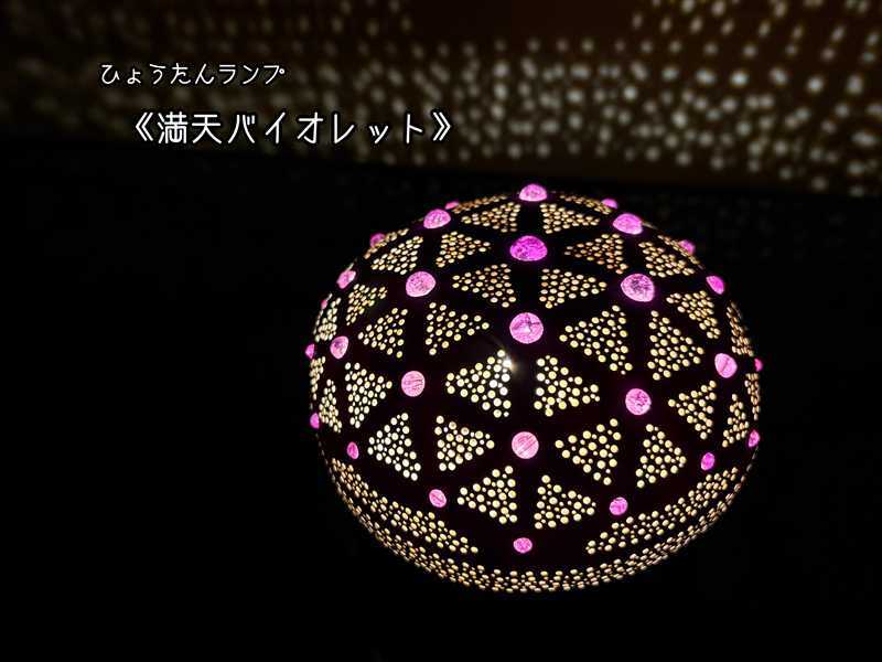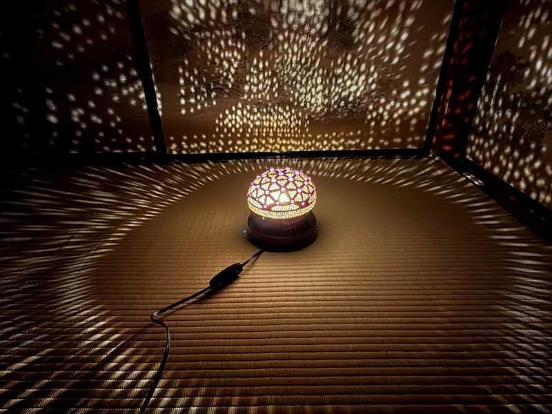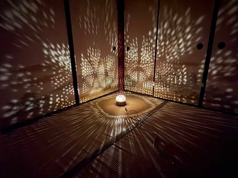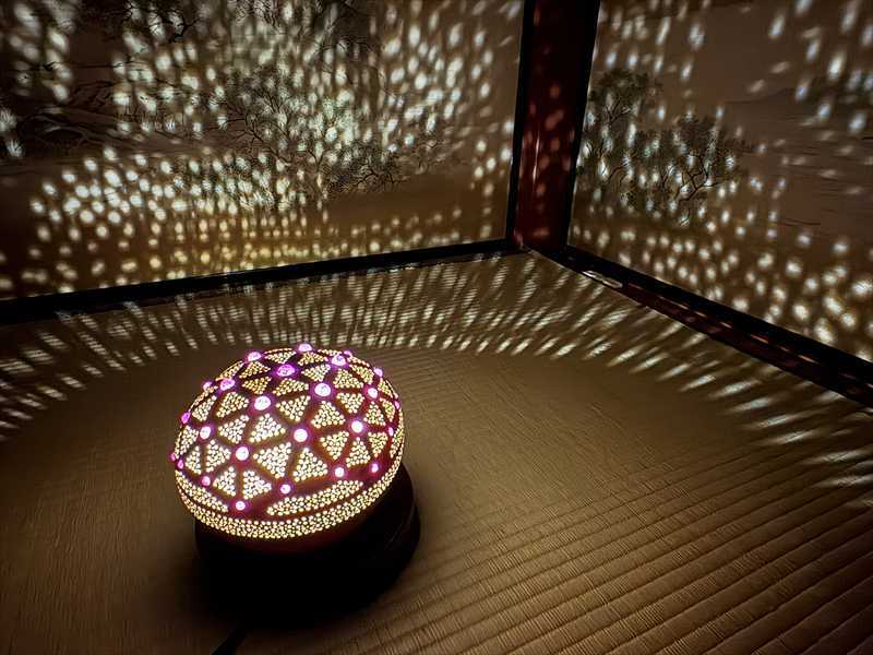 灯りをともすと、無数の星が夜空に瞬くように光がひょうたんの中から広がり、部屋全体を幻想的な空気で包み込みます。