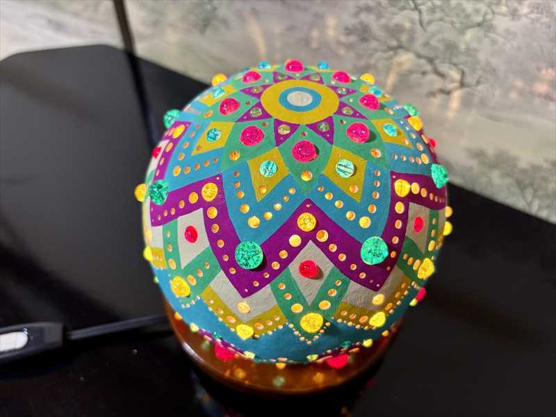 アクリルガッシュで曼荼羅のような緻密な模様を手描きし、ドリルで開けた無数の穴には多色のガラスビーズをあしらっています。