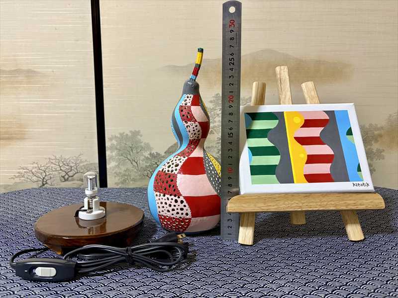 自家栽培・無農薬のひょうたんを使用したランプと、統一感のある抽象画を組み合わせたセット作品です。