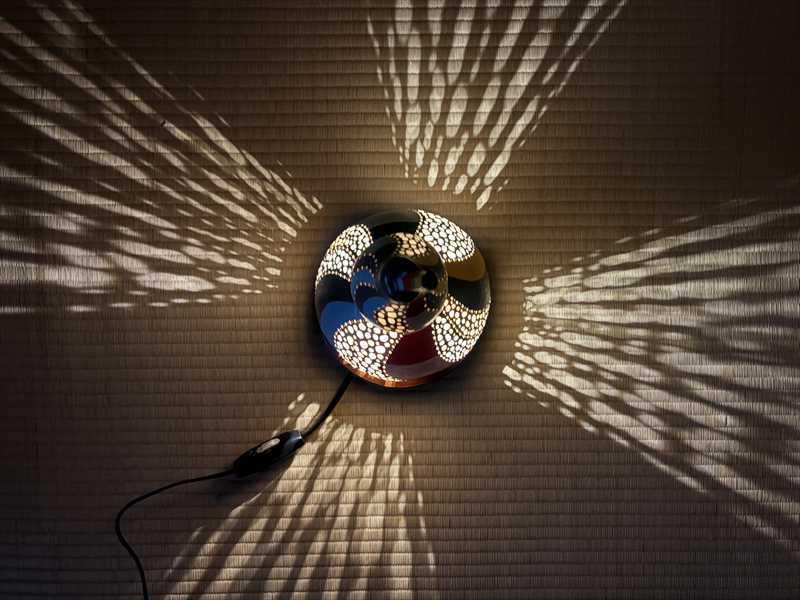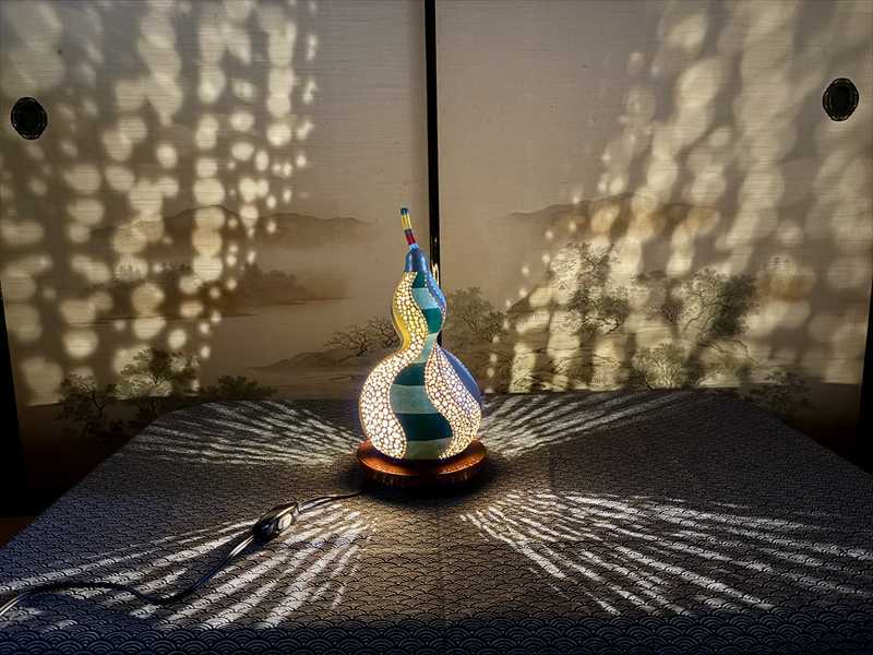 ひょうたんランプは、色彩から細工まで全て手作業。光を灯すと、壁や天井へ広がる陰影が静かな波を描き、空間に幻想的な雰囲気を生み出します。