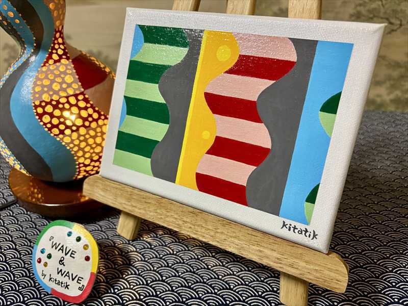 アクリルガッシュで彩った波の模様は、ランプと絵画それぞれに響き合い、ひとつの世界を作り出します。