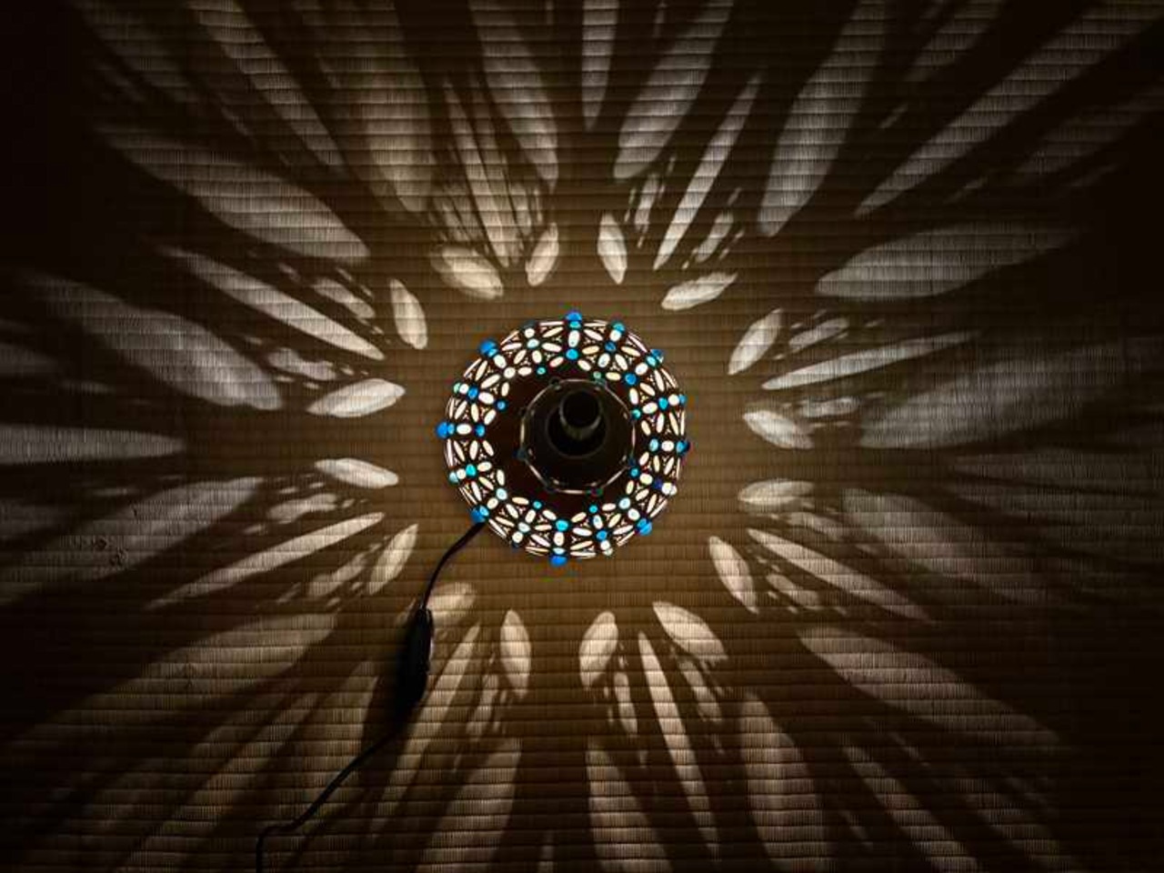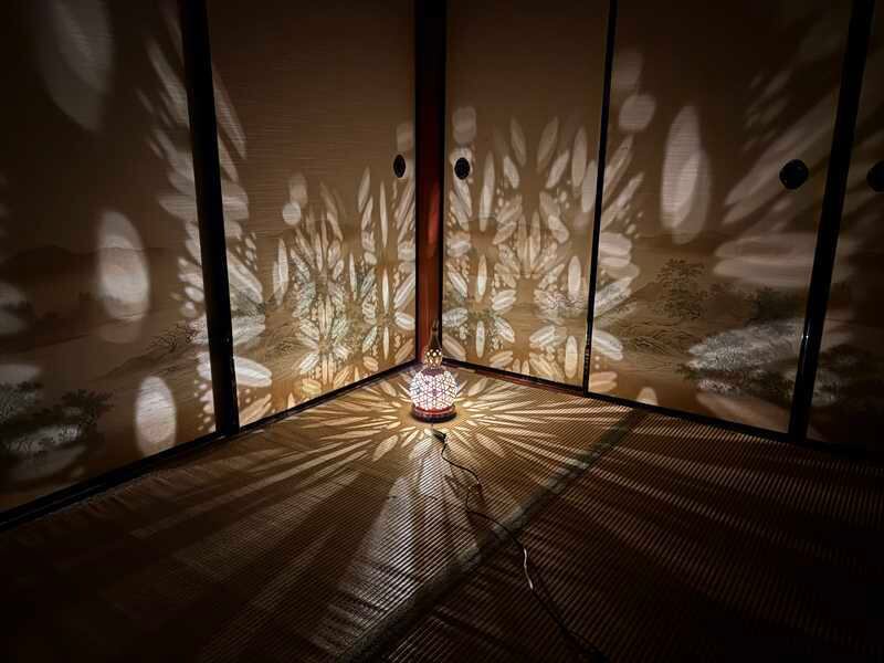スイッチを入れると、フラワーオブライフの神聖幾何学模様の影が空間に広がり、