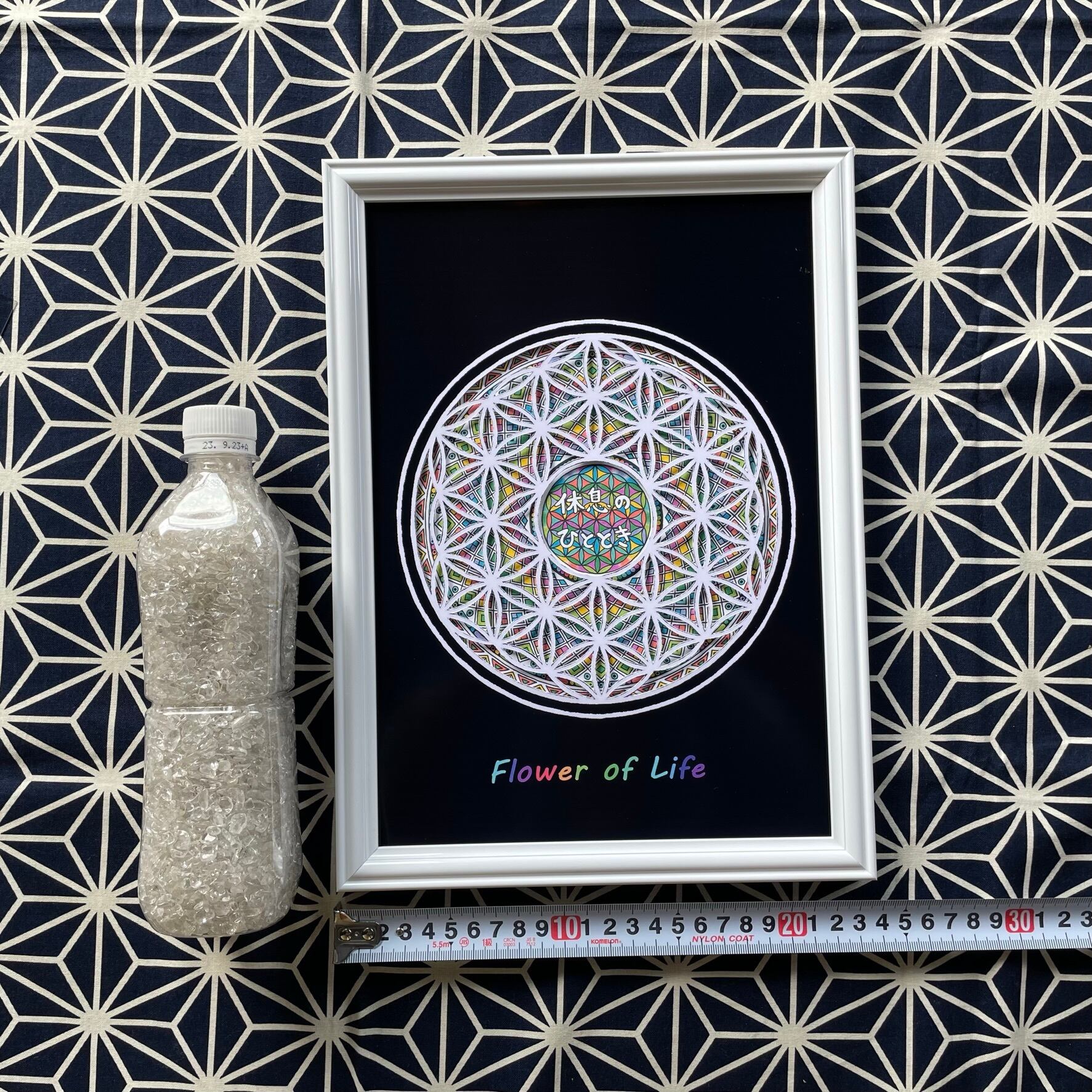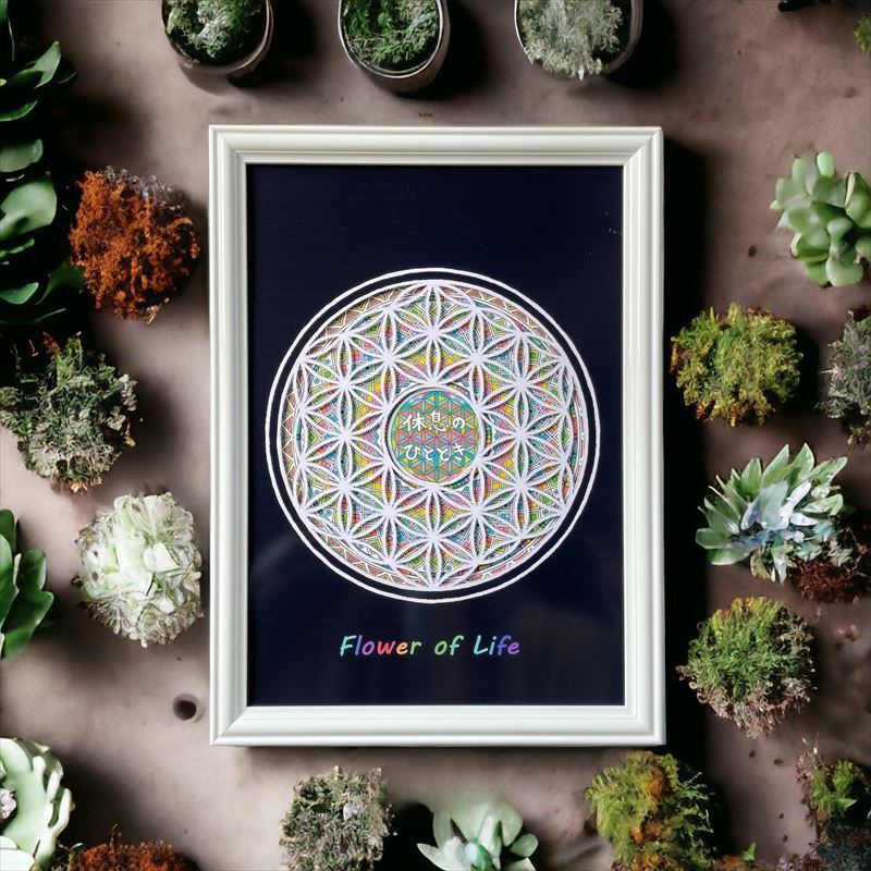 フラワーオブライフ切り絵と内側のアートとの間に空間を作り、少し浮かせることで奥行を出しました。