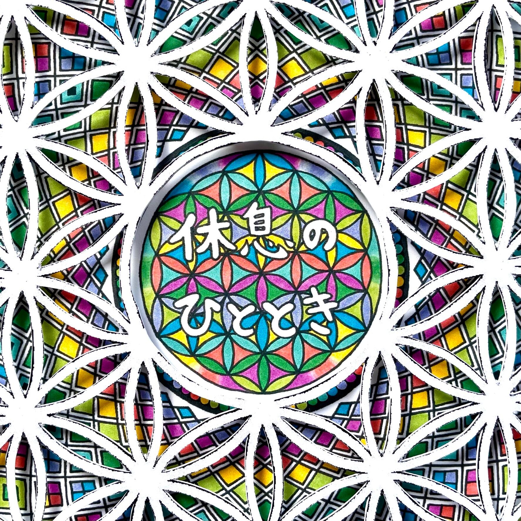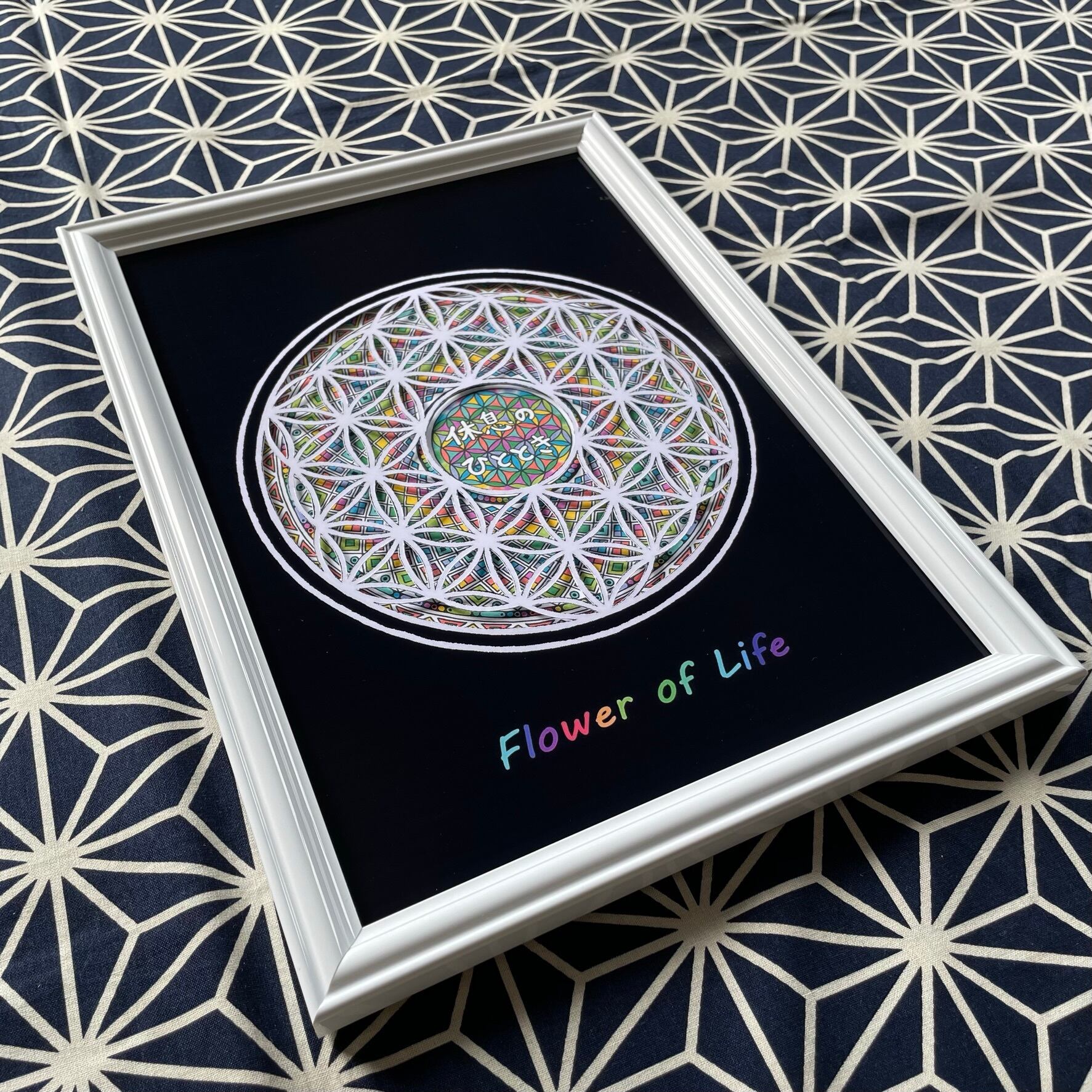 切り絵を施したフラワーオブライフと、内側のアート(当方作品「休息のひとときNo.3」のコピー)を重ねました。
