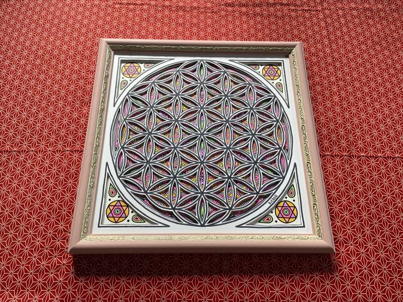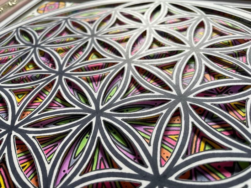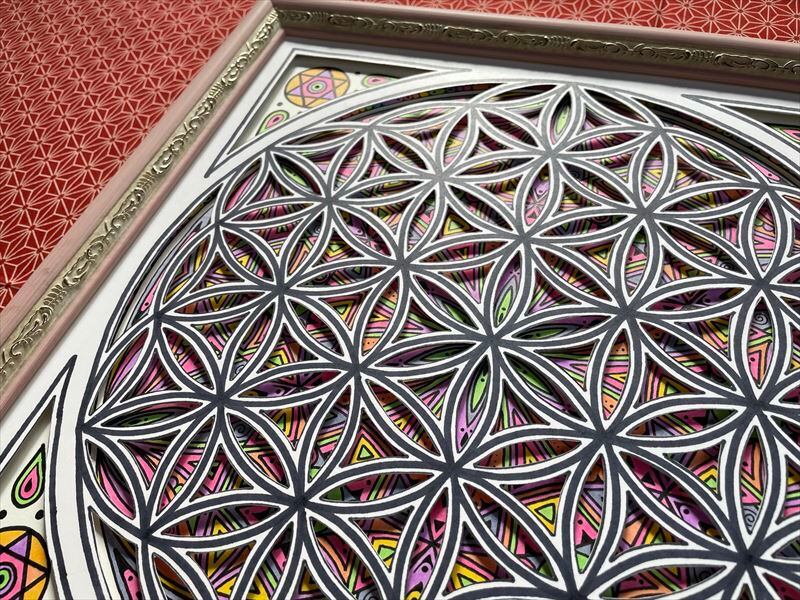 30cm角のピンク色の幾何学アートとフラワーオブライフの切り絵を重ねました。