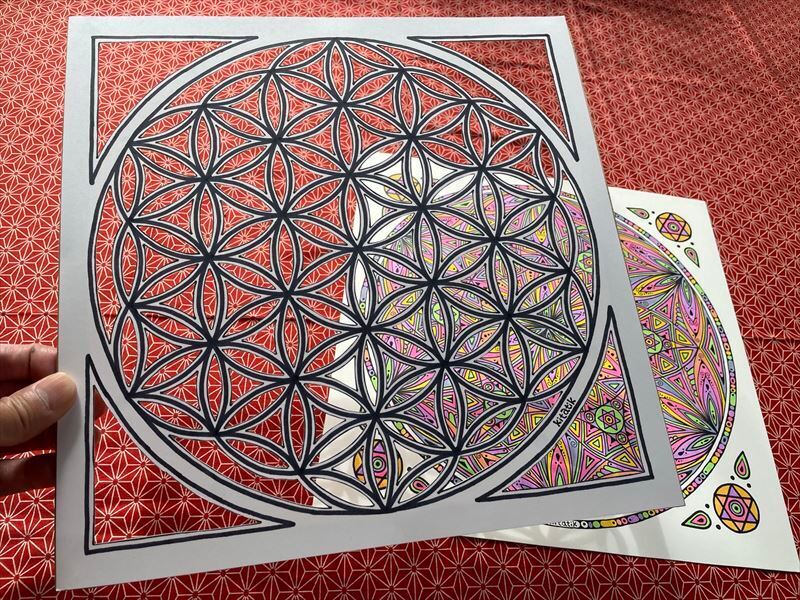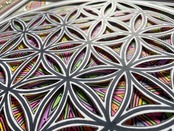 内側のピンク色の幾何学アートは、直径の違うフラワーオブライフを重ねたような模様。
