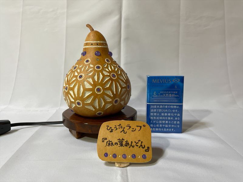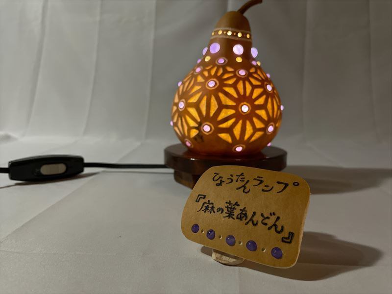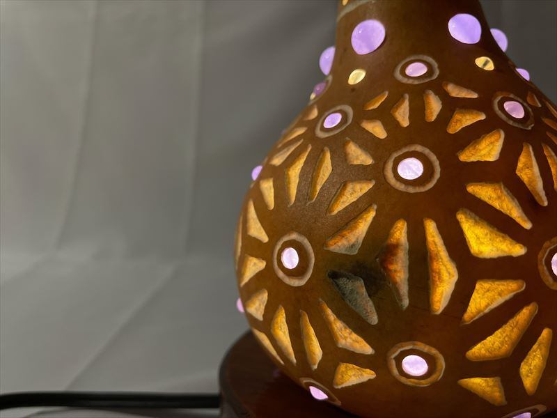 無農薬で自家栽培したミニサイズのしずく型ひょうたんを使って、手作業で麻の葉模様の細工を施したひょうたんランプです。