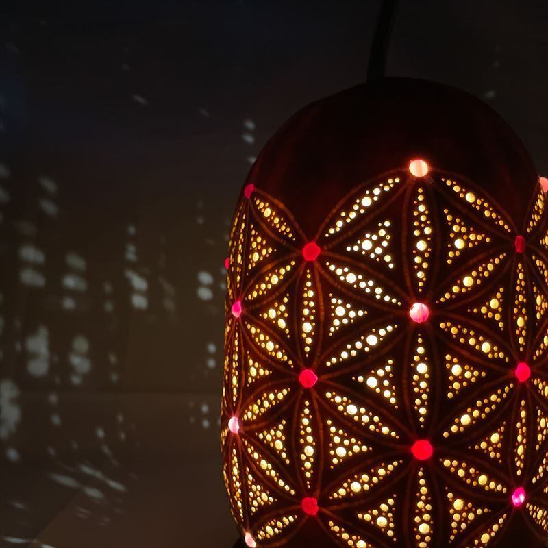 寸胴型のイボ瓢箪にフラワーオブライフ模様の細工を施しました。