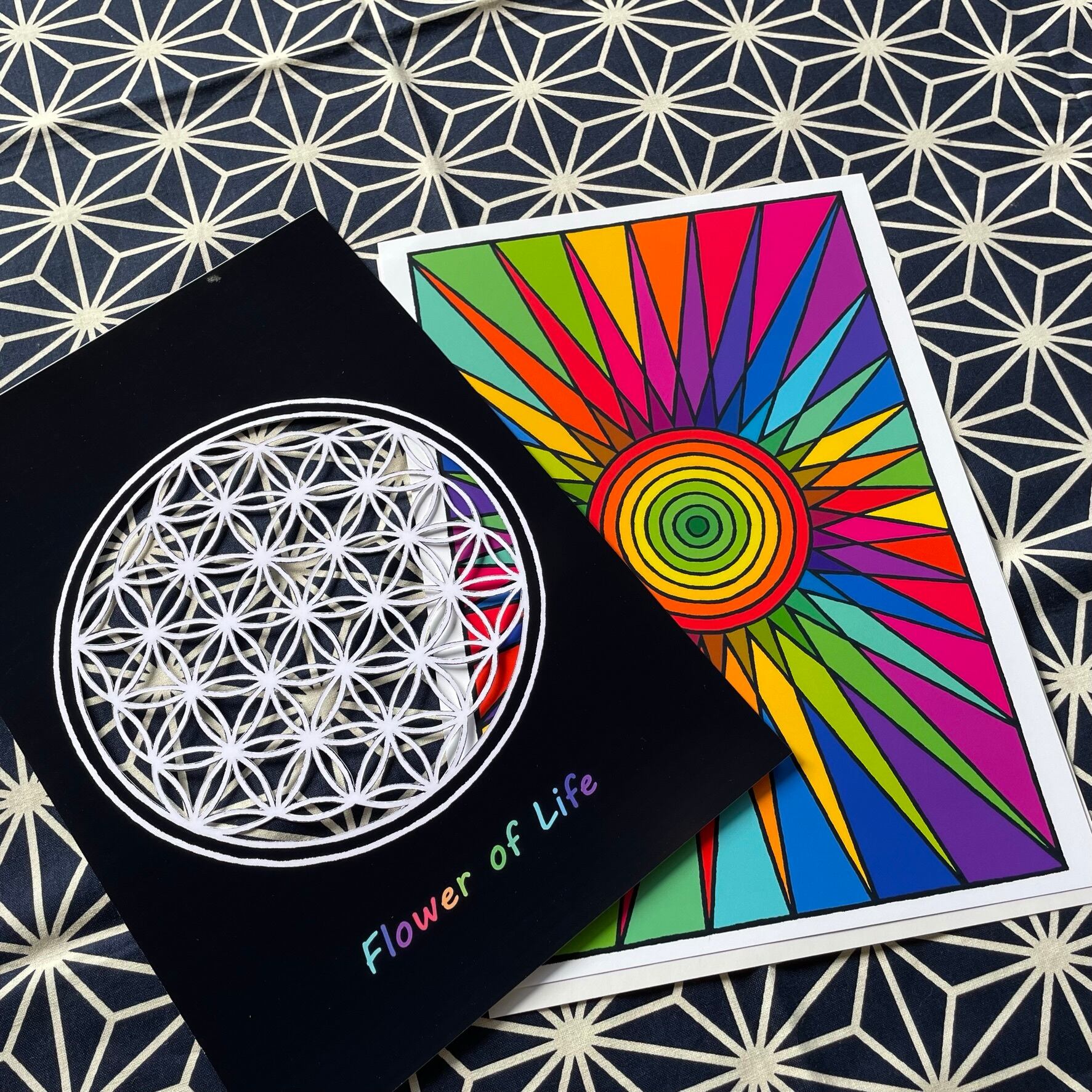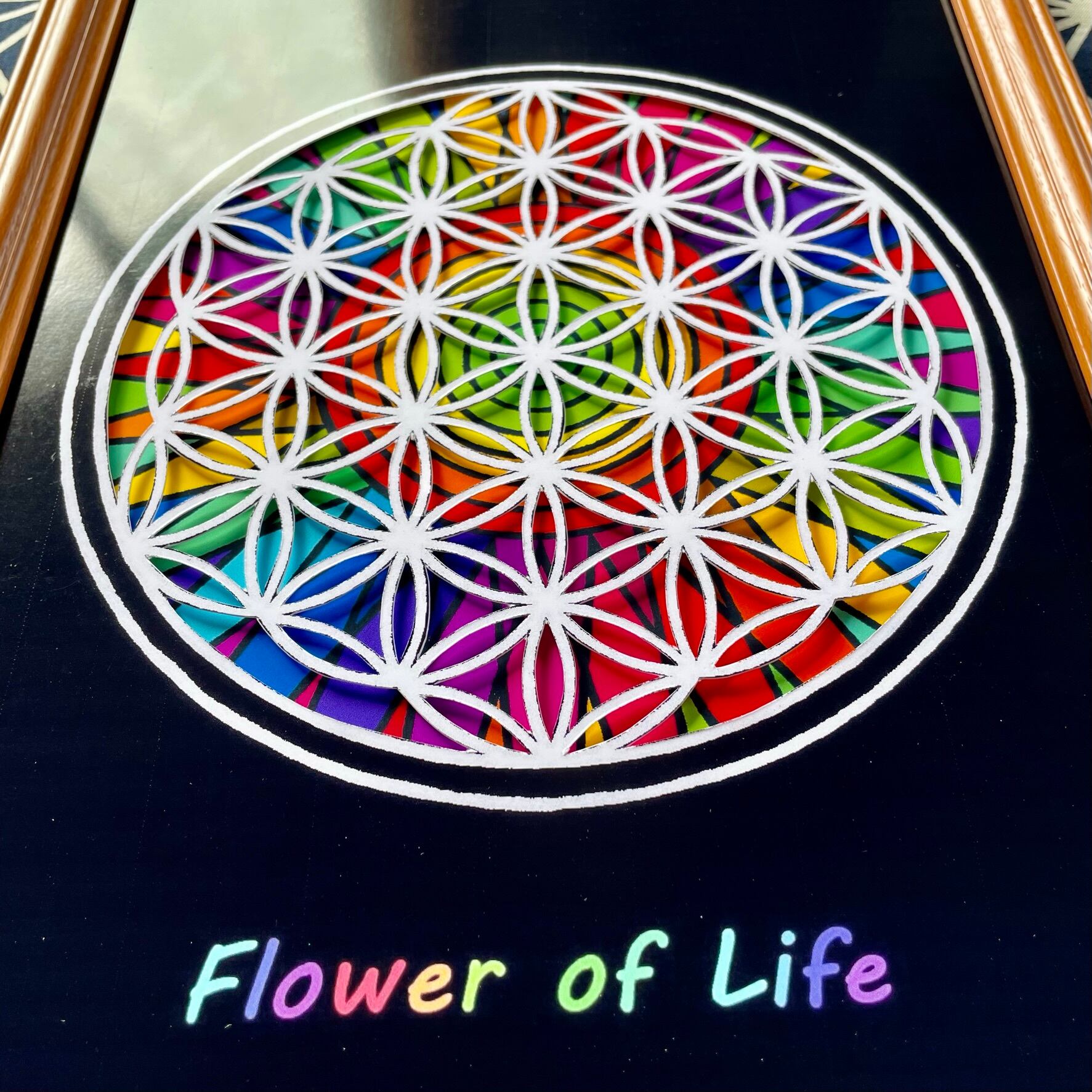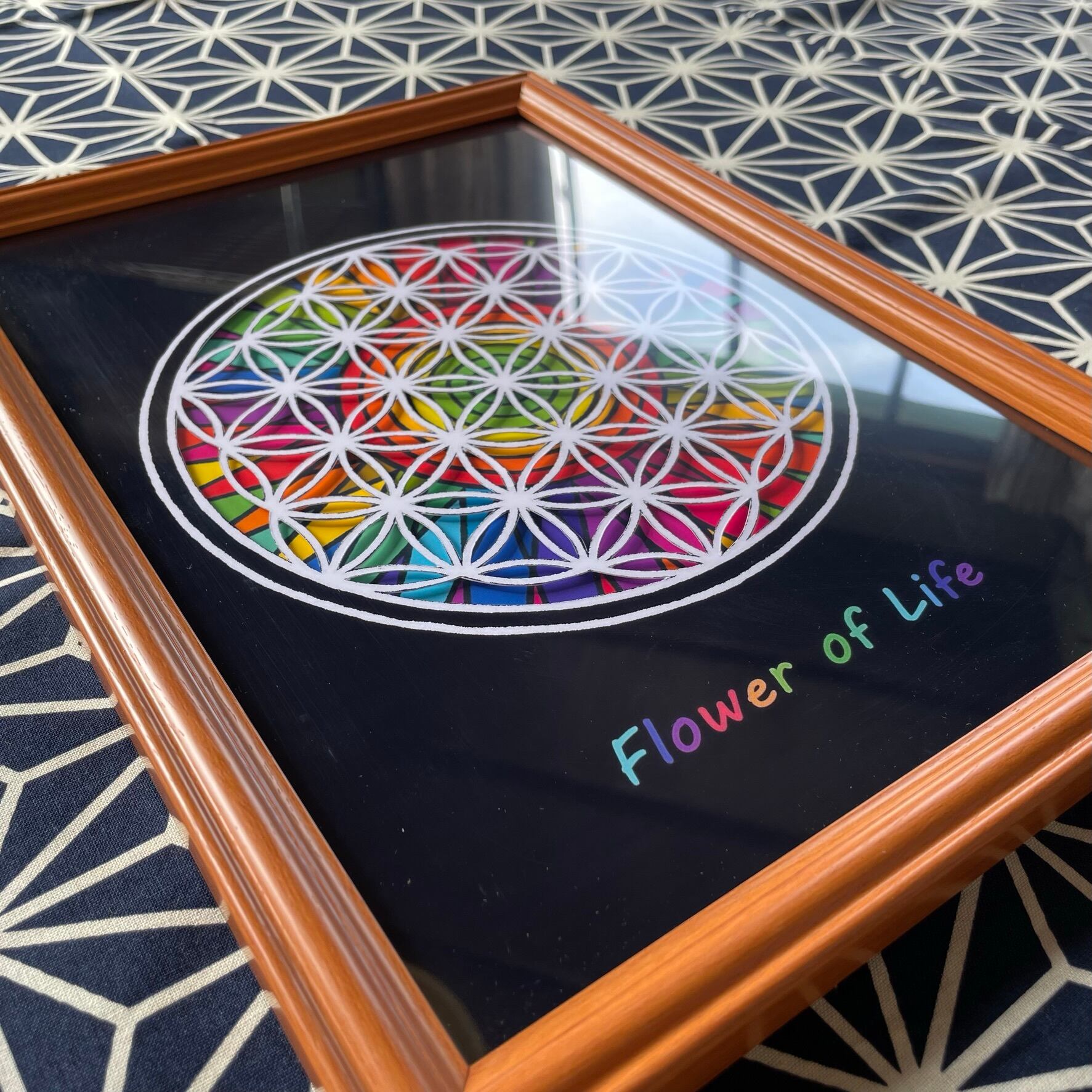 切り絵を施したフラワーオブライフの隙間からカラフルな当方オリジナルのアートが見えるようになっています。