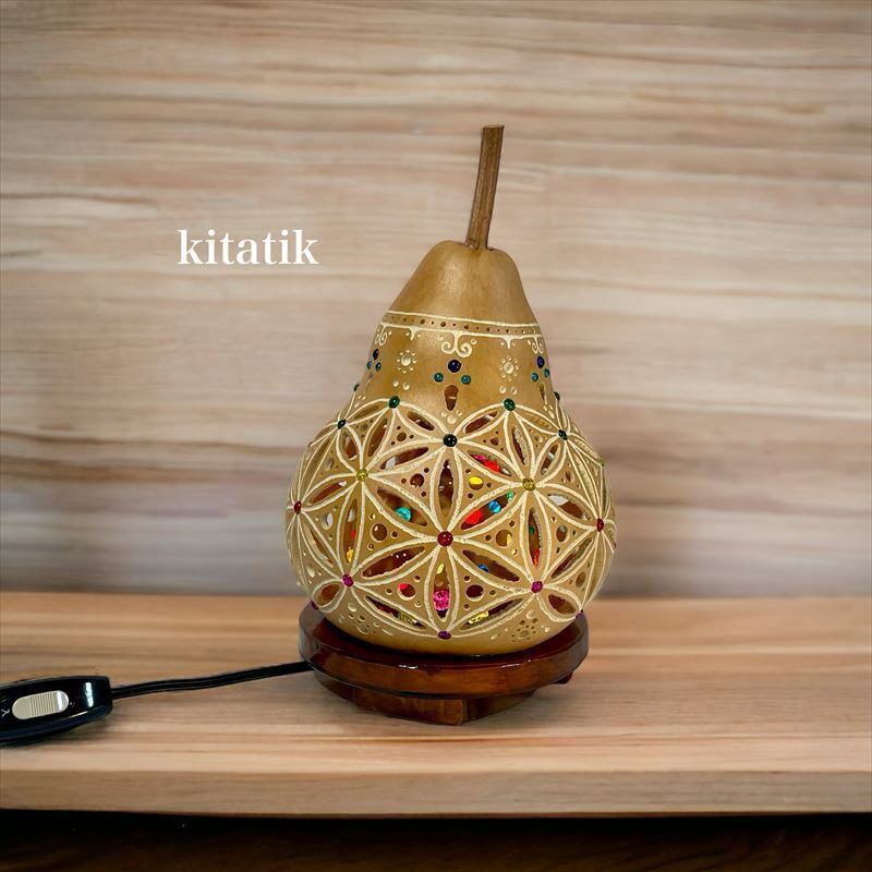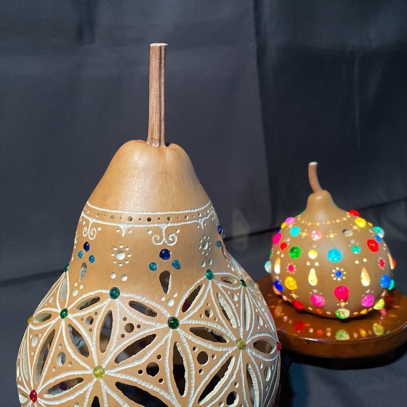 サイズの違う2つのひょうたんを使用して、小さいものを内側に、大きなものを外側にした二重構造になっています。外側のひょうたんには神聖幾何学フラワーオブライフの細工を施し、内側のひょうたんはガラスビーズでカラフルに彩りました。