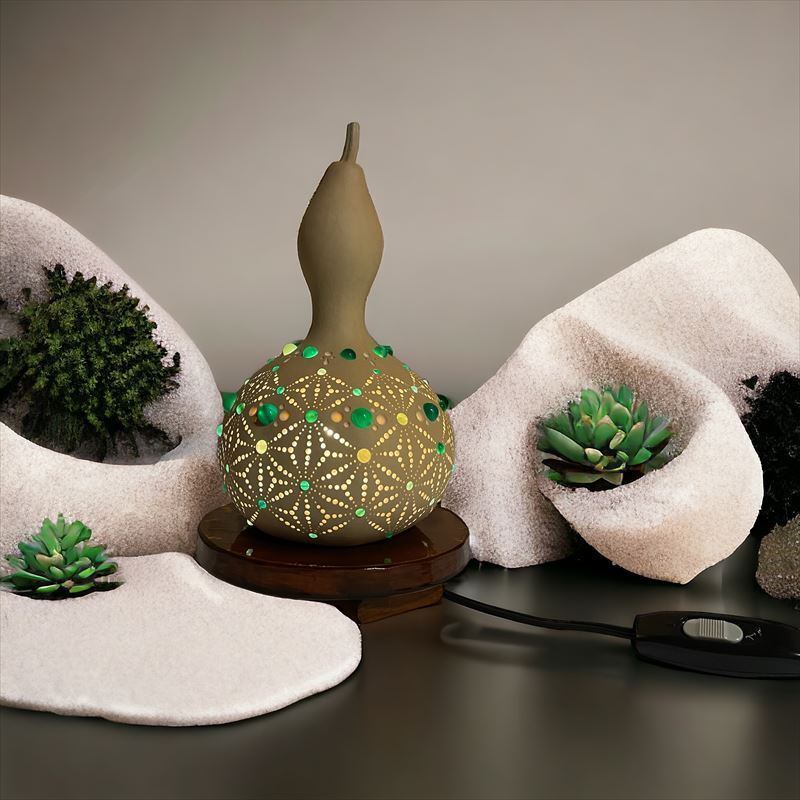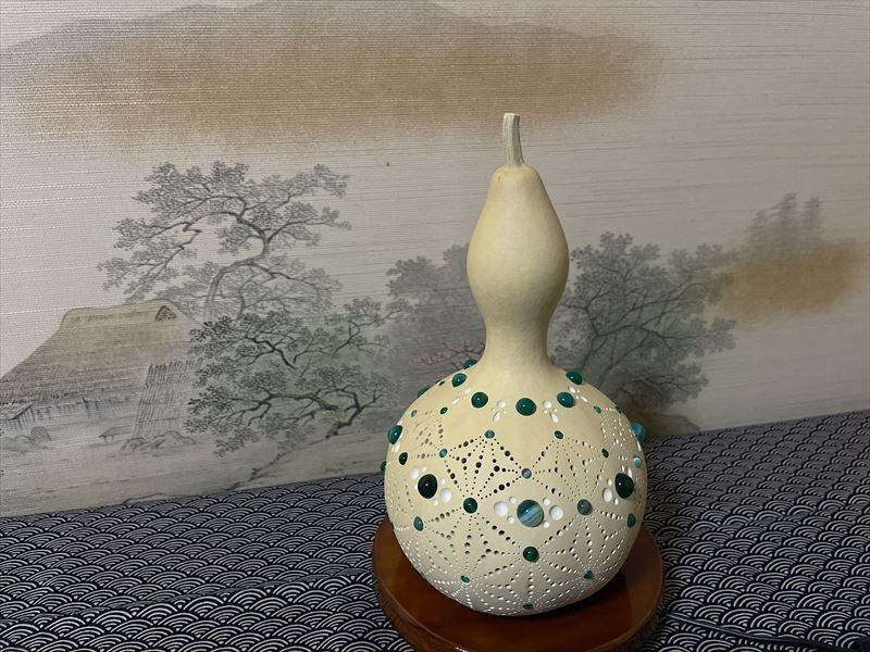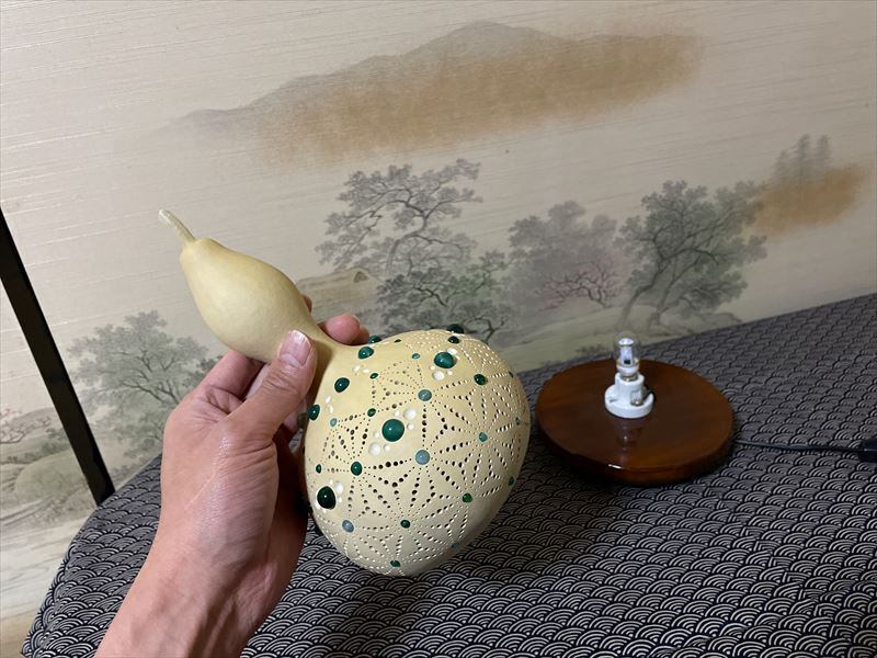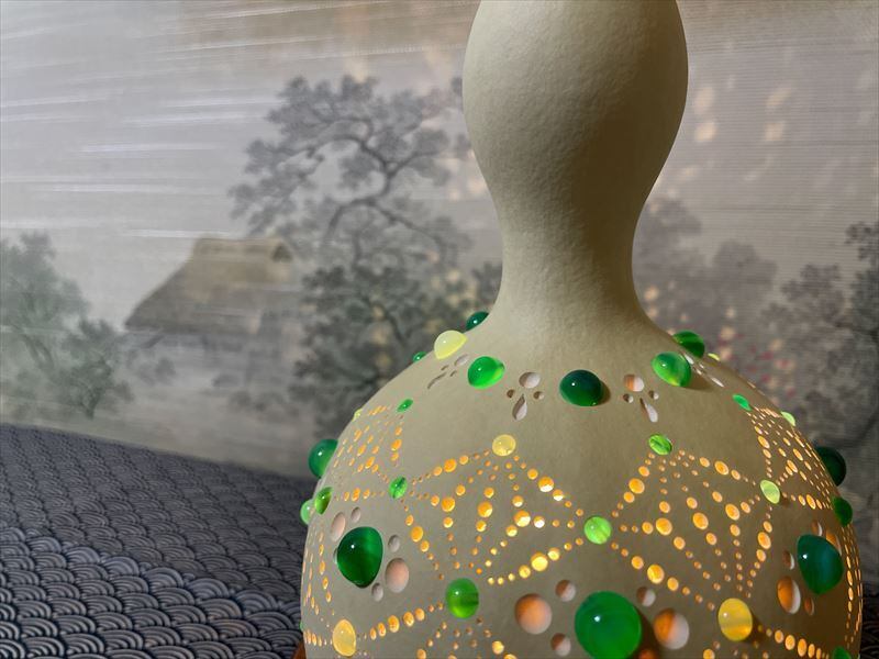無農薬で自家栽培したひょうたんに手作業で細工を施したひょうたんランプ「麻の葉みやび」の3作目になります。