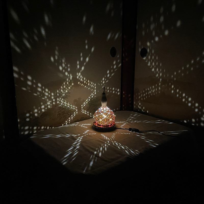 瓢箪の皮を数ミリ削り残す透かし彫りを全体に施し、その薄い部分から優しい行燈のような光がこぼれます。