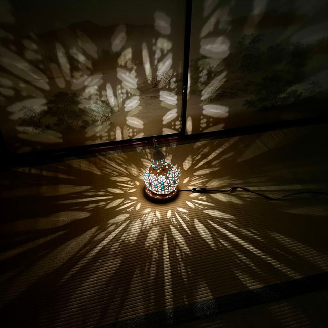 神聖幾何学フラワーオブライフは、宇宙の創造や生命の根源が表されている模様で、見る人に強い生命力を与えるとも言われます。ひょうたんを通した優しい光と、神聖幾何学の優れたデザインにより、あなたの生活の中にパワフルで深い癒しをもたらしてくれるでしょう。